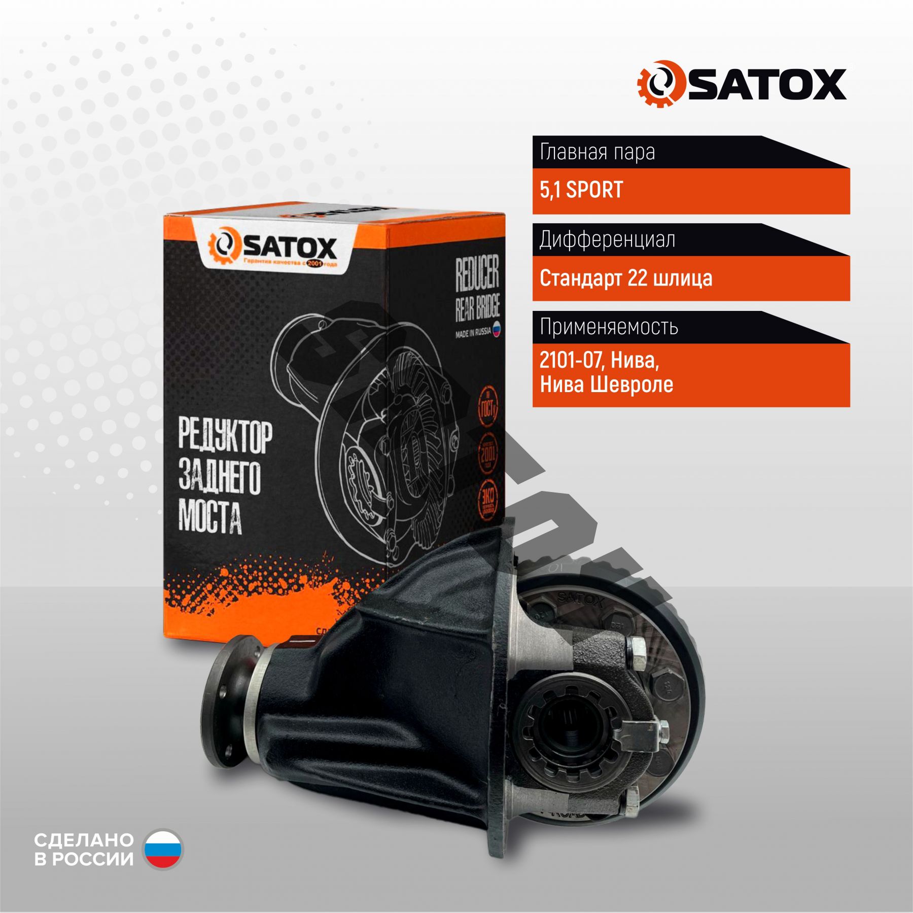Оригинальный спортивный редуктор заднего моста SATOX с передаточным числом 5,1 (главная пара 8/41) для автомобилей ВАЗ. Подходит для «Классики» (2101–2107) и «Нивы» (2121–2131, Шевроле Нива 2123). Имеет усиленную конструкцию для повышенных нагрузок, полностью отрегулирован на заводе, гарантия — 6 месяцев.